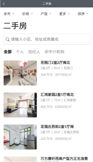 4、系統(tǒng)將展示該城市所有二手房源信息,包含戶型圖與價(jià)格等詳細(xì)參數(shù)。