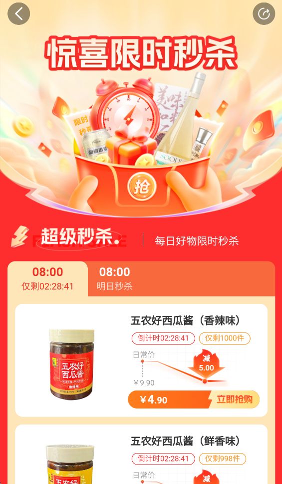 2、進去我們可以看到今天和明天的秒殺開始時間和商品。