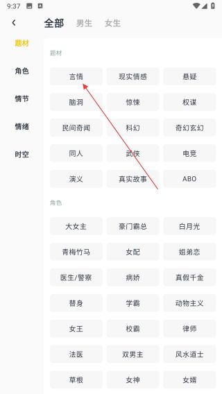 2、分類頁(yè)選【言情】題材,篩選言情小說(shuō)。