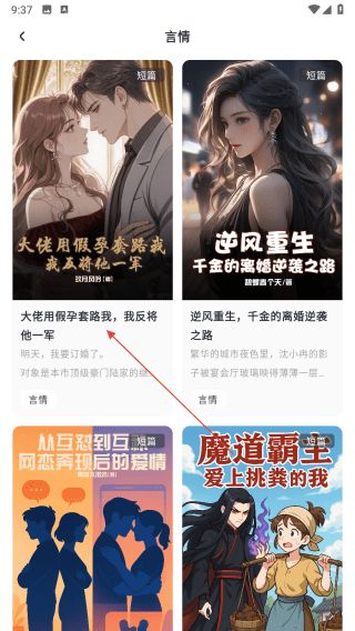 3、言情小說(shuō)列表選感興趣作品,點(diǎn)封面進(jìn)入閱讀。