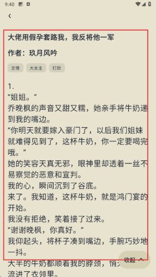 4、進(jìn)入書(shū)籍詳情頁(yè),瀏覽正文內(nèi)容,開(kāi)始閱讀言情小說(shuō)。