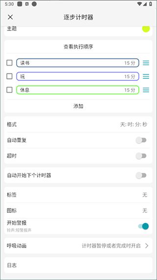 5. 間隔計時器: 將多個計時器拼接組成一個功能強大的計時器。該計時器會在每個計時器開始的時候發(fā)出警報,并在計時完成的時候,自動開始下一個計時器。該計時器時候鍛煉的時候使用。