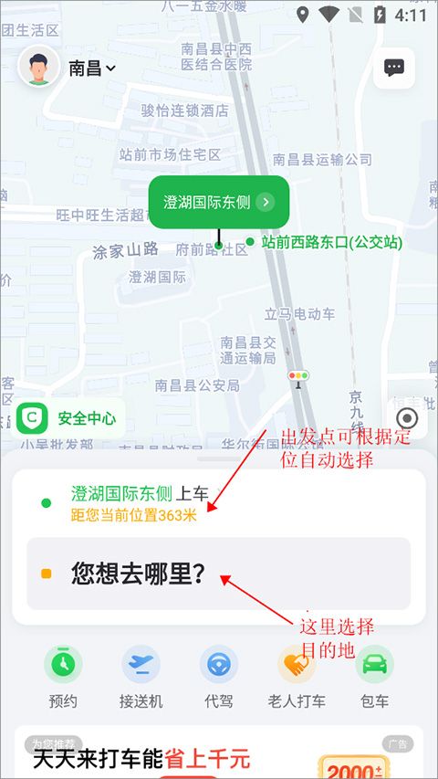 1、用戶打開并登錄軟件后,進入頁面選擇出發(fā)地點(一般會根據(jù)用戶的手機定位進行自動選擇)和目的地