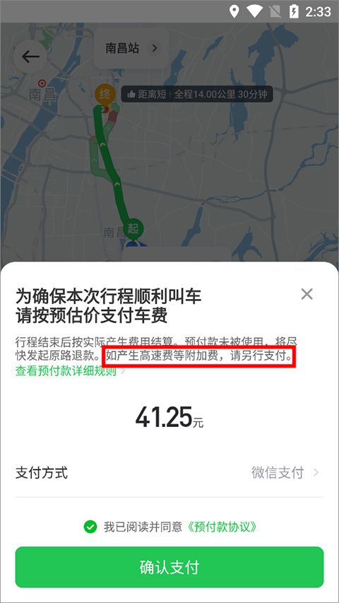 下圖是支付頁面的截圖,下圖中的紅色方框內(nèi)的文本信息可以說明高速費用應(yīng)該由乘客自己承擔