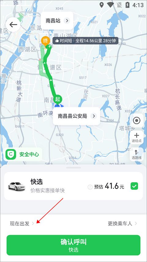 2、接著在打開的新頁面中,會顯示路線圖和車型、預(yù)估費用,用戶需要點擊【現(xiàn)在出發(fā)】(下圖紅色箭頭所指)確認下出發(fā)時間