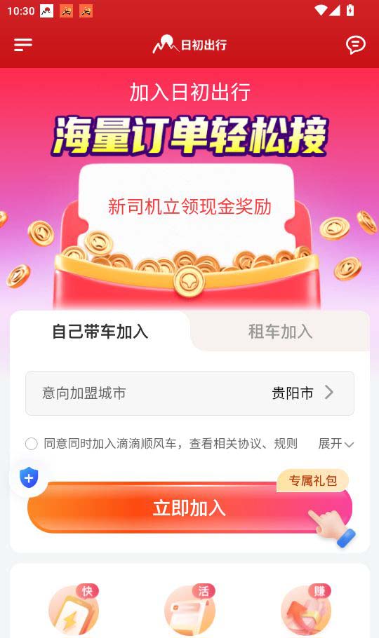 3.之后可選擇“自己帶車加入”模式并選擇意向加盟城市點(diǎn)擊“立即加入”