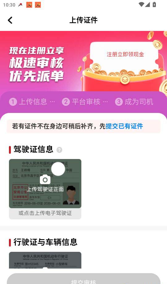4.最后將你的駕駛證、行駛證與車輛信息上傳后點(diǎn)擊“提交審核”即可注冊(cè)司機(jī)