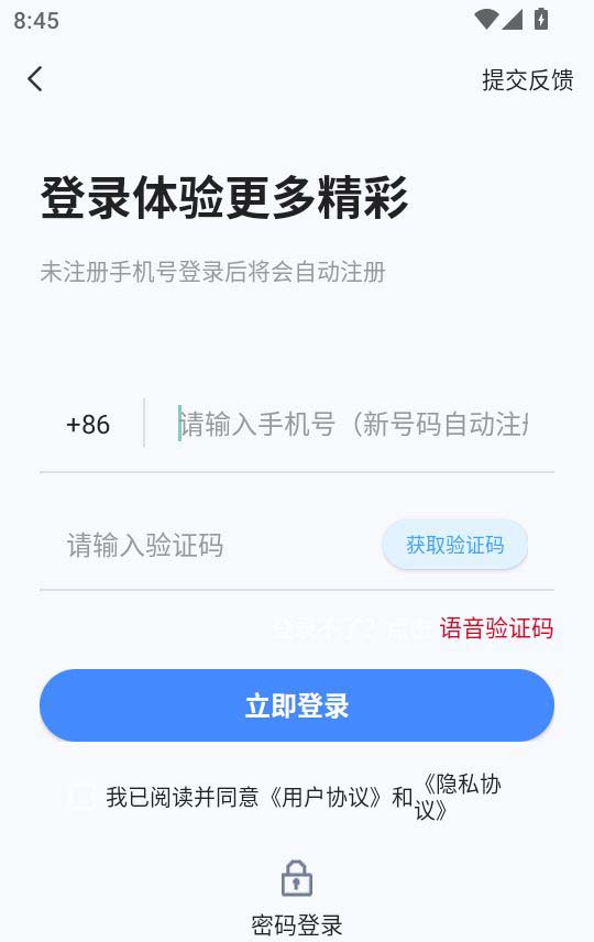 2.在登錄界面輸入手機號與驗證碼后,點擊“立即登錄”按鈕進入程序
