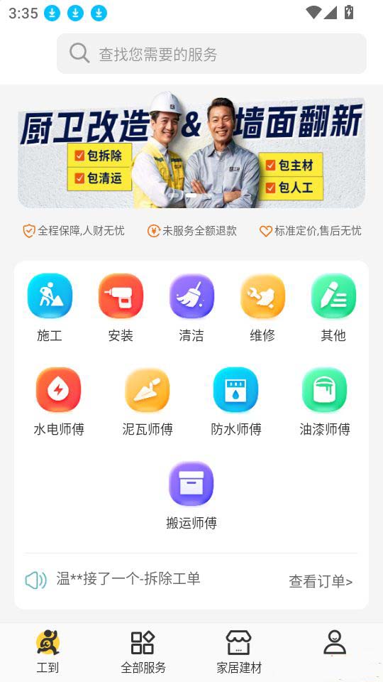軟件提供了線上的即時用工,業(yè)主可以隨時發(fā)單下單,工友師傅可以在線接單服務(wù)。