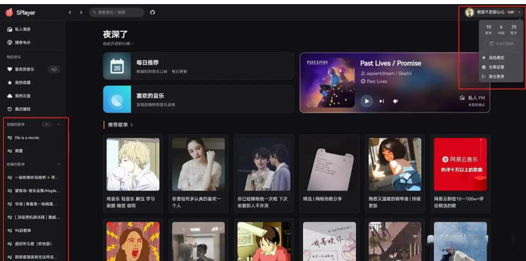同時右上角可以登陸,等了后會同步你的信息,包括會員信息、你的歌單、收藏專輯以及歌手都有的。不同于其他的項目,該項目能直接同步歌單,這就意味著不需要再去創(chuàng)建歌單或者搜索歌曲聽了。