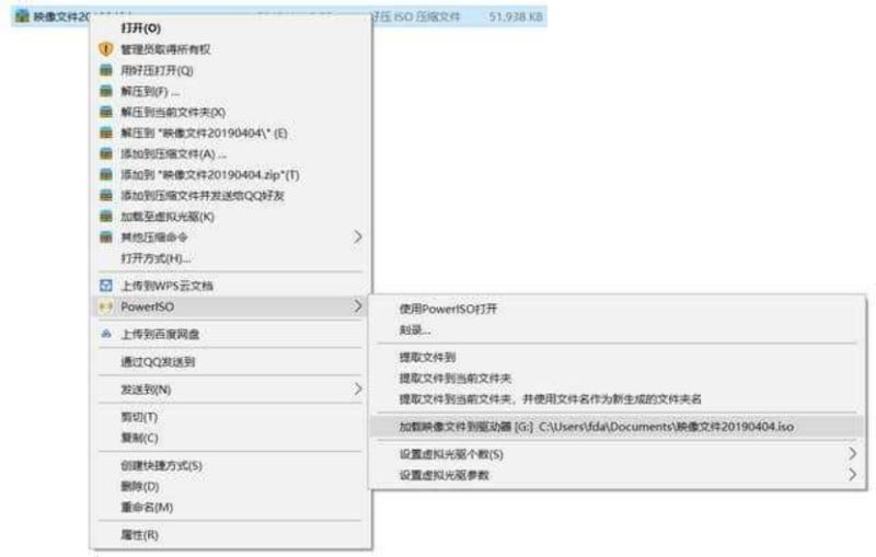 右鍵單擊映像文件,在彈出的快捷菜單選擇“PowerISO>加載映像文件到驅(qū)動(dòng)器”選項(xiàng)。