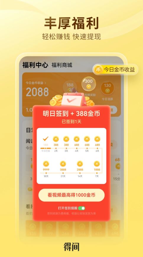 3、金幣系統(tǒng)看小說(shuō)還能賺零花錢?沒(méi)錯(cuò)!簽到福利、閱讀福利、睡前福利…..前方福利高能,只要你來(lái),我們就送不停。