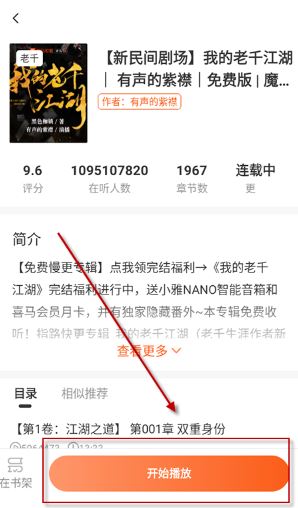 3、選中作品后進入播放界面,點擊“開始播放”即可收聽,可通過界面按鈕控制暫停、播放。