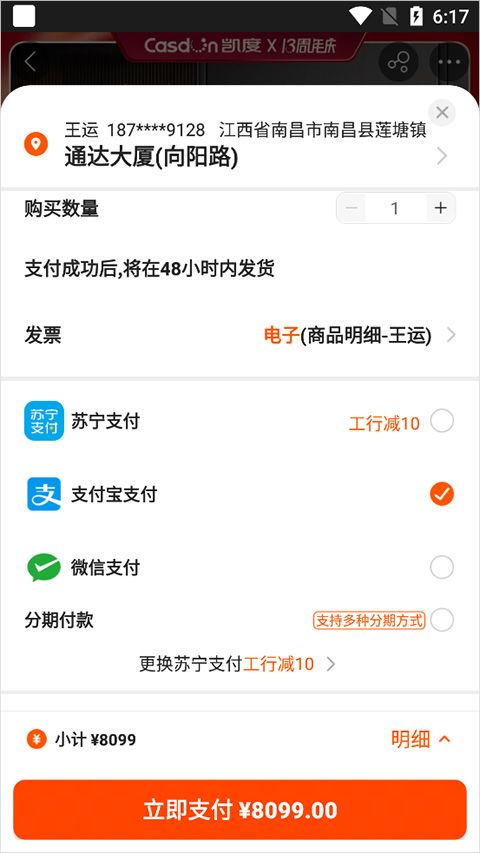 5、最后選擇支付方式進行支付即可,用戶在支付時可使用支付寶支付、微信支付,或蘇寧會員用戶用蘇寧支付進行免密碼支付。