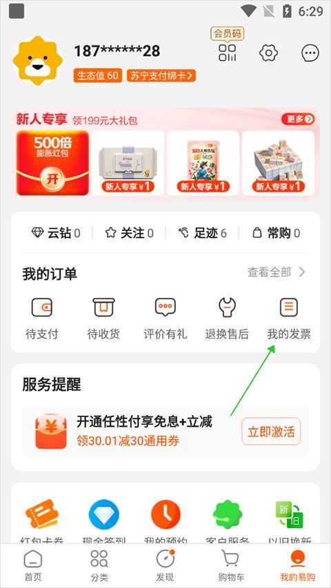 3、如果用戶需要對已開具的發(fā)票需要更換時,可以進入【我的易購】頁面中點擊【我的發(fā)票】。