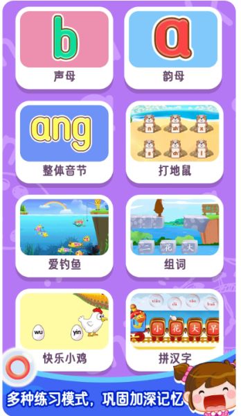 1、設(shè)計(jì)拼音釣魚、快樂捕魚等16種拼音游戲,將學(xué)習(xí)與益智游戲相結(jié)合,讓孩子在游戲中鞏固拼音知識(shí)。