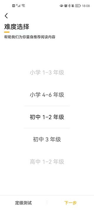1、打開在本站下載的軟件后,在進(jìn)入首頁中,可以選擇你認(rèn)為可以閱讀的年級(jí)段內(nèi)容,也可以對(duì)自己進(jìn)行一個(gè)定級(jí)測(cè)試。