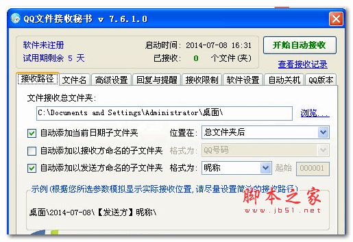 QQ文件自動(dòng)接收管家是基于騰訊QQ開發(fā)的第三方QQ輔助軟件。QQ接收秘書可同時(shí)接收QQ好友發(fā)來多個(gè)文件和多個(gè)QQ多個(gè)好友發(fā)來的圖文/照片等文件/文件夾,文件接收時(shí)不影響正常的鼠標(biāo)、鍵盤操作,并自動(dòng)歸類、回復(fù)。當(dāng)您外出或不在電腦旁的時(shí)候開啟該軟件,該軟件會(huì)為您全自動(dòng)接收客戶發(fā)來圖文,避免您接收不到客戶文件的煩惱。如在電腦旁也可開啟該軟件省時(shí)、省力,最大限度地提高工作效率、節(jié)省等待時(shí)間!