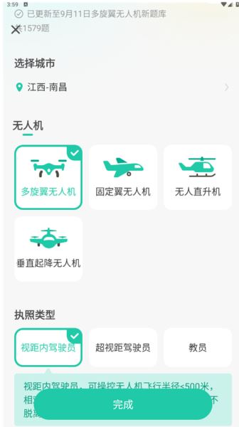 1、進(jìn)入軟件根據(jù)需求選擇無(wú)人機(jī)類型以及執(zhí)照類型。
