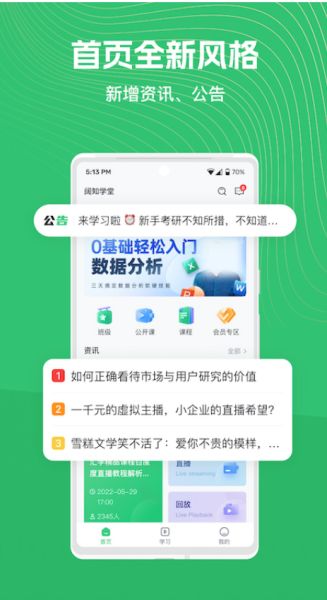 知享學(xué)堂最新版是杭州闊知網(wǎng)絡(luò)科技有限公司推出的手機(jī)網(wǎng)校在線學(xué)習(xí)應(yīng)用,原名叫做闊知學(xué)堂,可以滿足學(xué)員和教職工線上學(xué)習(xí)辦公需求。該應(yīng)用采用簡(jiǎn)潔的頁(yè)面設(shè)計(jì)方式,以多樣界面主題和個(gè)性化設(shè)置首頁(yè)方式涵蓋各類(lèi)教學(xué)資源展示形式,而且允許學(xué)員們自由設(shè)置首頁(yè),以滿足其個(gè)性化學(xué)習(xí)方式。同時(shí)應(yīng)用在啟動(dòng)之后,學(xué)員可以通過(guò)搜索或者掃碼的方式加入網(wǎng)校,加入網(wǎng)校后即可快速進(jìn)行學(xué)習(xí)。