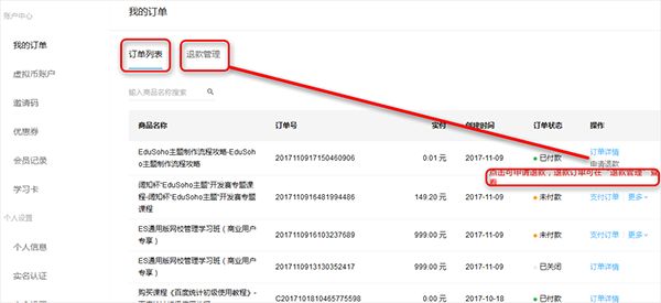 2、目前在退款有效期內(nèi),若學(xué)員訂單未過(guò)退款有效期,可以通過(guò)操作中的【申請(qǐng)退款】進(jìn)行退款申請(qǐng)操作,填寫(xiě)退款原因后點(diǎn)擊提交等待網(wǎng)校處理;