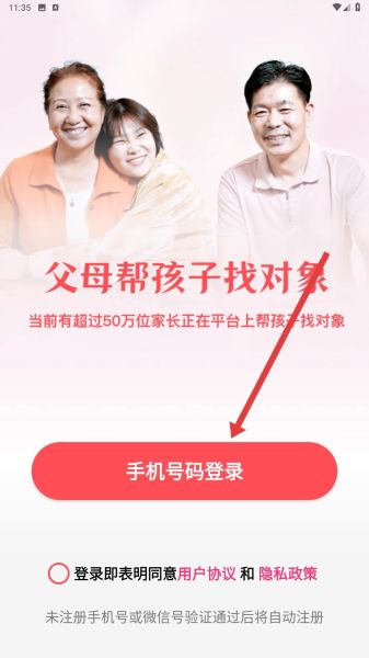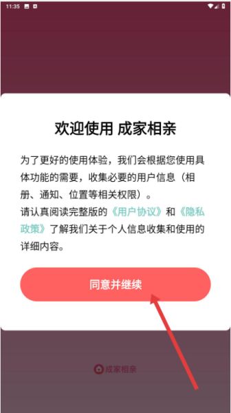 1、打開成家相親應用程序,在彈出的歡迎界面,仔細閱讀關于收集用戶信息的相關說明,點擊紅色的同意并繼續(xù)按鈕,進入登錄界面。