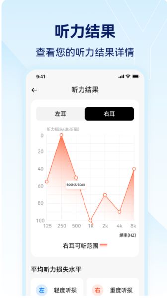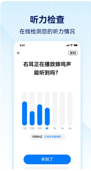 測(cè)聽:通過純音測(cè)試,給左右耳播放不同頻段,幫助聽損患者檢測(cè)聽力受損程度,并提供專業(yè)定制方案;