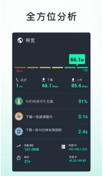 一鍵點擊,即出網(wǎng)速測試結(jié)果。