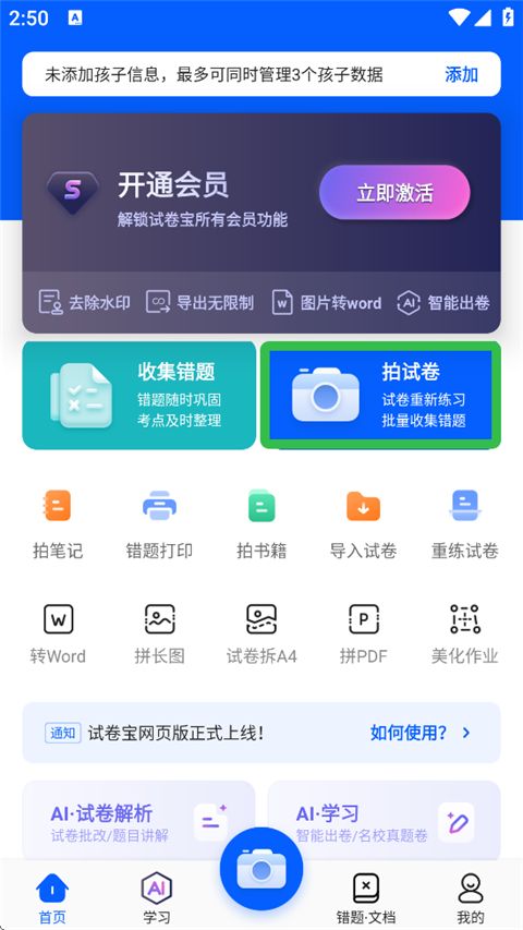 1、打開(kāi)試卷寶app,點(diǎn)擊【拍試卷】。