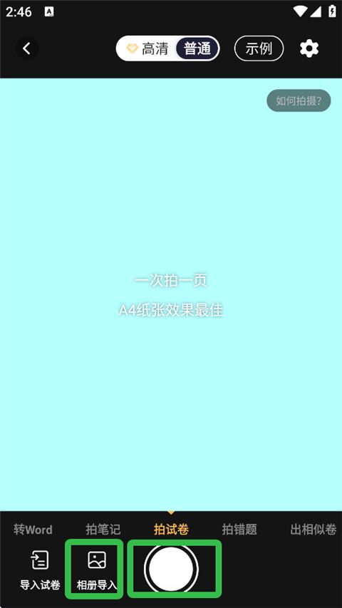 2、點(diǎn)擊正下方圓形圖標(biāo)拍攝卷子,或點(diǎn)擊【相冊(cè)導(dǎo)入】上傳卷子。