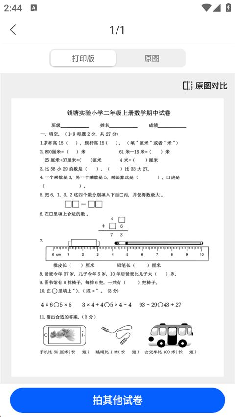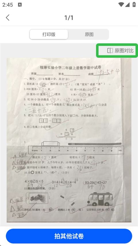 5、點(diǎn)擊【原圖對(duì)比】可查看原卷子,以便題目進(jìn)行比對(duì)。