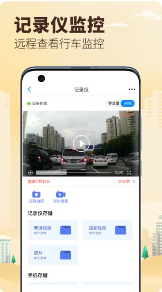 【記錄儀管理】兜風(fēng)兼容720P/1080P記錄儀接入,遠程查看記錄儀實時監(jiān)控視頻,支持下發(fā)記錄儀拍照和視頻錄制指令,可下載記錄儀內(nèi)照片和視頻到手機。