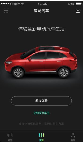 1、打開(kāi)小威隨行APP,在首頁(yè)感受威馬汽車(chē)帶來(lái)的全新電動(dòng)汽車(chē)生活愿景,還可點(diǎn)擊“虛擬體驗(yàn)”提前領(lǐng)略,或“立即成為車(chē)主”開(kāi)啟專(zhuān)屬旅程。