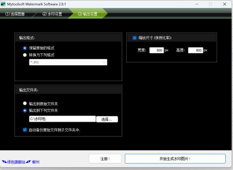 第三步:輸出設(shè)置 - 可以設(shè)置添加水印后的圖片格式,輸出位置。