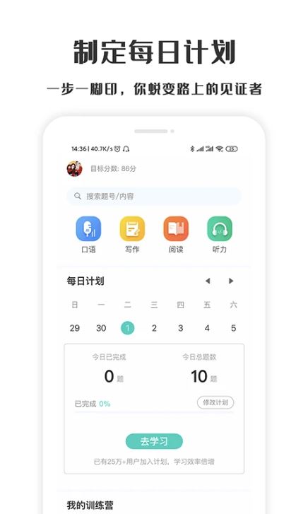 1、還有口語???,幫助用戶進(jìn)行口語鍛煉,制定每日學(xué)習(xí)計劃,讓學(xué)習(xí)更高效。