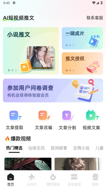 小說推文神器app是一款A(yù)I驅(qū)動的短視頻創(chuàng)作利器,專為小說推廣量身打造。平臺提供海量爆款視頻模板和智能素材庫,支持一鍵生成高質(zhì)量推文視頻。更集成了AI文案改寫、圖文提取、智能配圖等全流程創(chuàng)作工具,從文字處理到視頻輸出,讓您輕松完成從小說到短視頻的華麗轉(zhuǎn)變。