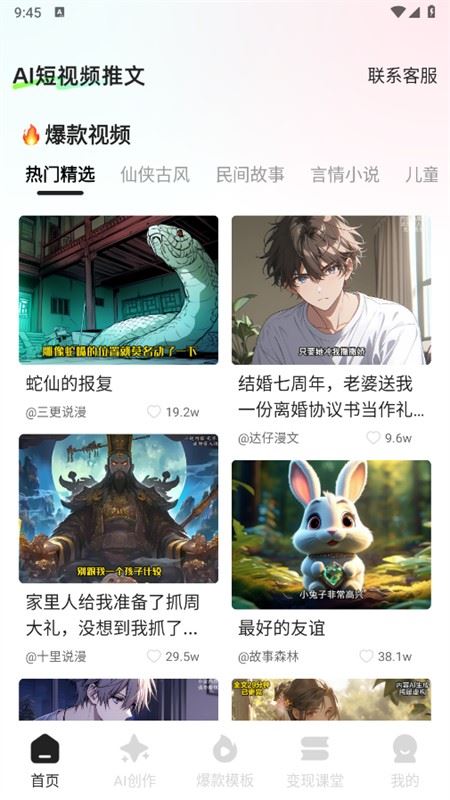 基于用戶輸入的關(guān)鍵詞或故事梗概,AI能自動生成短視頻腳本,節(jié)省創(chuàng)作者大量時間,置多種視頻模板,涵蓋不同風(fēng)格和場景,用戶可根據(jù)需求選擇或自定義模板。