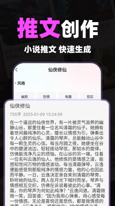 用戶只需輸入小說角色、情節(jié)梗概或關(guān)鍵詞,AI小說推文便能迅速生成引人入勝的推文內(nèi)容,幫助創(chuàng)作者快速擴大作品影響力。支持多種寫作風(fēng)格選擇,民間故事、電影解說等滿足不同讀者的閱讀偏好。