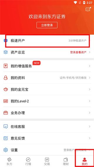 1、首先點擊東方贏家app“我的”極速開戶,或者在首頁點擊開戶;