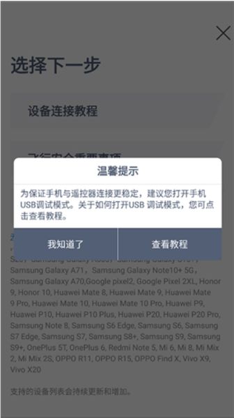 3、選擇設(shè)備后,為保證手機(jī)與遙控器連接更穩(wěn)定,您還需要開啟手機(jī)的USB調(diào)試模式。