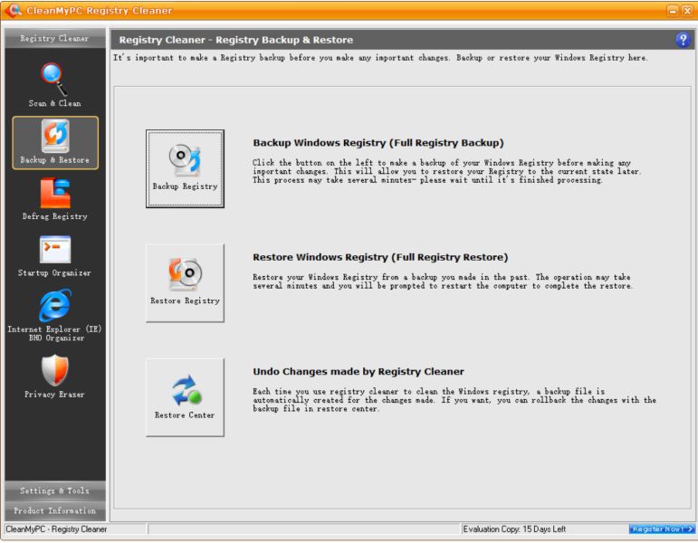 CleanMyPC Registry Cleaner的注冊表整理模塊可以優(yōu)化您的注冊表,通過移動注冊表文件使之緊湊合理,以此改進整個系統(tǒng)性能