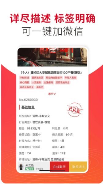 1、找店服務(wù),根據(jù)地點(diǎn)查找附近門店的轉(zhuǎn)讓信息,可以在線聯(lián)系店主進(jìn)行一對(duì)一的詳談;