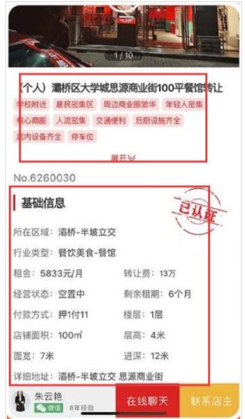 5、可以在線查看門店的詳細(xì)信息,包括店鋪基本信息、配套的設(shè)施、轉(zhuǎn)讓費(fèi)、面積、租金等;