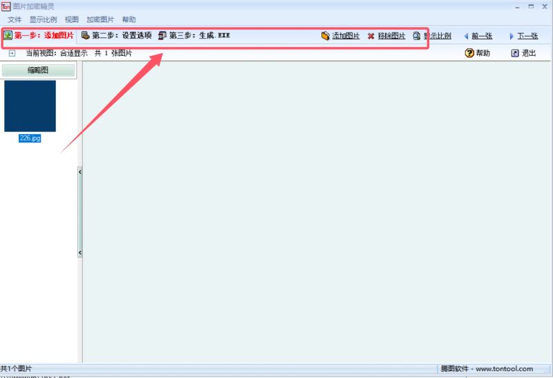 在圖片瀏覽界面中,左側(cè)顯示了圖片的縮略圖,右側(cè)顯示單個(gè)圖片。上面是工具條和當(dāng)前操作的說(shuō)明,在狀態(tài)欄中會(huì)顯示提示信息。點(diǎn)擊圖片時(shí),狀態(tài)欄會(huì)顯示圖片的詳細(xì)信息。在在主窗口中點(diǎn)擊“添加圖片”來(lái)選擇要保護(hù)的Jpg或者Bmp圖片。“移除圖片”是將圖片從當(dāng)前視圖中移除。加載與移除圖片均可批量操作。