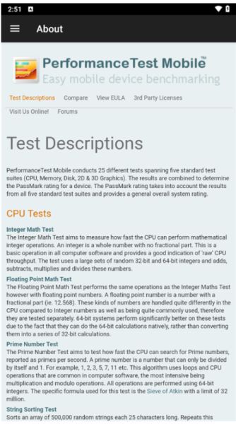performancetest手機(jī)版是一款功能十分強(qiáng)大的性能測試工具,全稱叫做PassMark PerformanceTest Mobile,該軟件可以幫助您進(jìn)行檢測,并且還可以查明并量化硬件升級(jí)或配置更改帶來的實(shí)際性能差異。軟件總共就包含了多種測試項(xiàng)目,如:CPU測試、磁盤測試、內(nèi)存測試、2D/3D圖形測試等等。