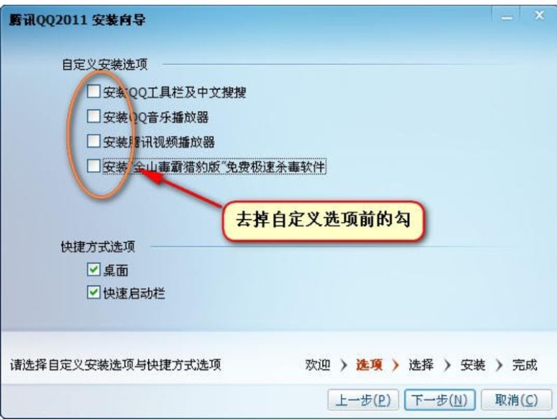 方法如圖:將不喜歡的產(chǎn)品,勾掉,小編我是只裝QQ的,其它的垃圾:),個(gè)人愛好。不是罵騰訊!