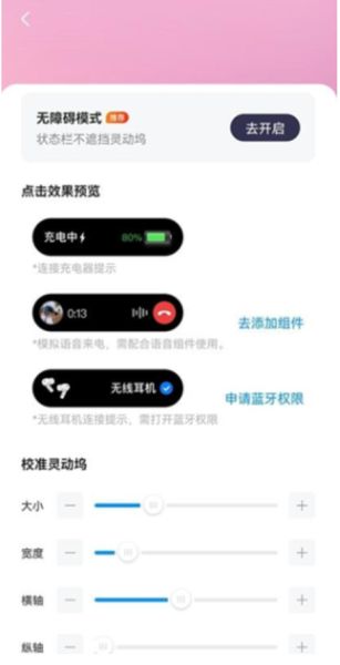 2、進(jìn)入功能頁面后,打開“開啟靈動塢”的開關(guān),然后開啟懸浮窗和無障礙模式權(quán)限;