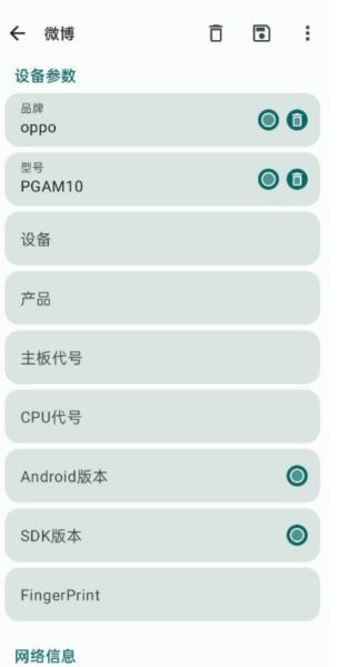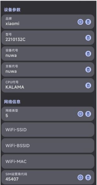 支持修改設備品牌、型號、IMEI、Android ID、WiFi/基站信息(SSID/BSSID)、SIM運營商代碼、語言、電量等20+項參數(shù)。
