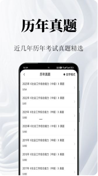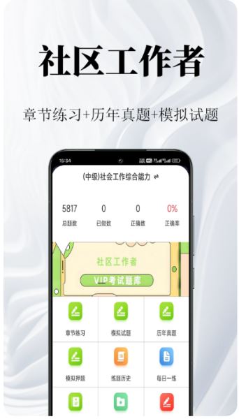 在APP主界面,可以看到各種題庫(kù)分類(lèi),如初級(jí)社會(huì)工作綜合能力、初級(jí)社會(huì)工作實(shí)務(wù)、中級(jí)社工法規(guī)與政策等。