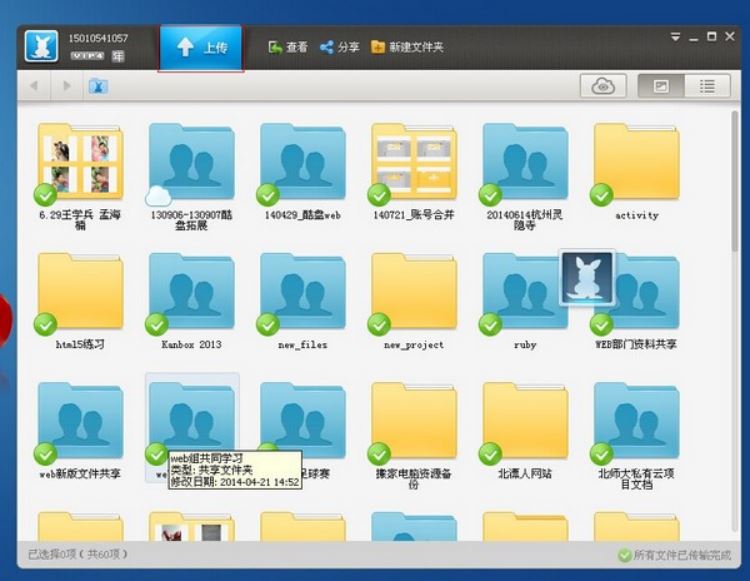 2. 在酷盤界面上點(diǎn)擊 “上傳” 按鈕選擇文件或文件夾上傳至酷盤,也可以直接拖拽我的電腦、我的桌面、資源管理器的文件到酷盤界面進(jìn)行上傳。